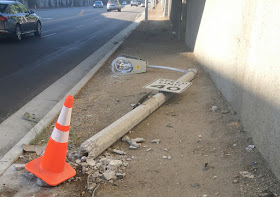 A streetlight rests on the sidewalk at Sepulveda. The sole and unpaved sidewalk herewith fully blocked. Bruins will have to lift their bike over this obstacle. Wheel chair? Forget it! Who would dare to block a traffic lane for cars for a whole week? UCLA Bike Fairy (him/her) makes the call to have it removed, presto. Because pedestrians and cyclists are important for UCLA. Very. Very very.